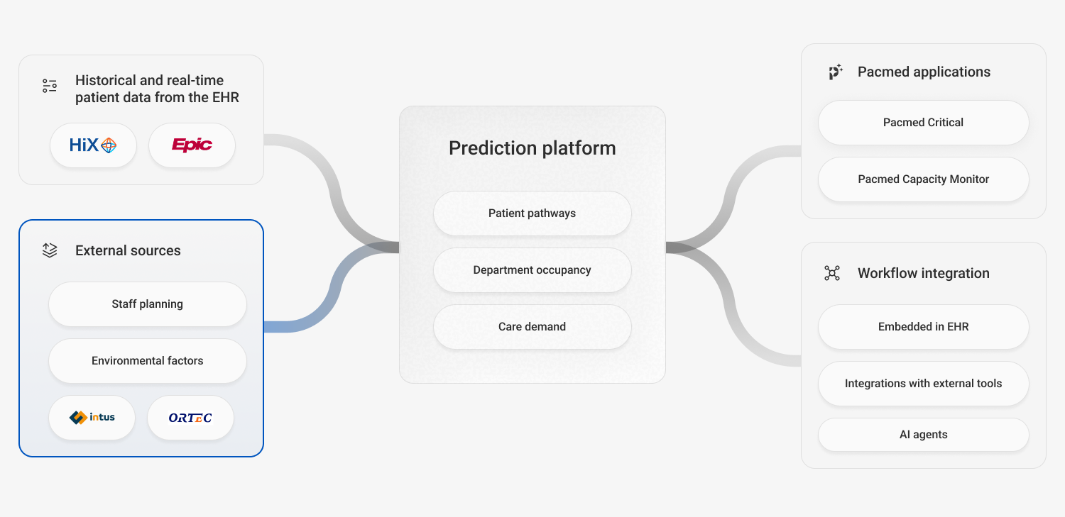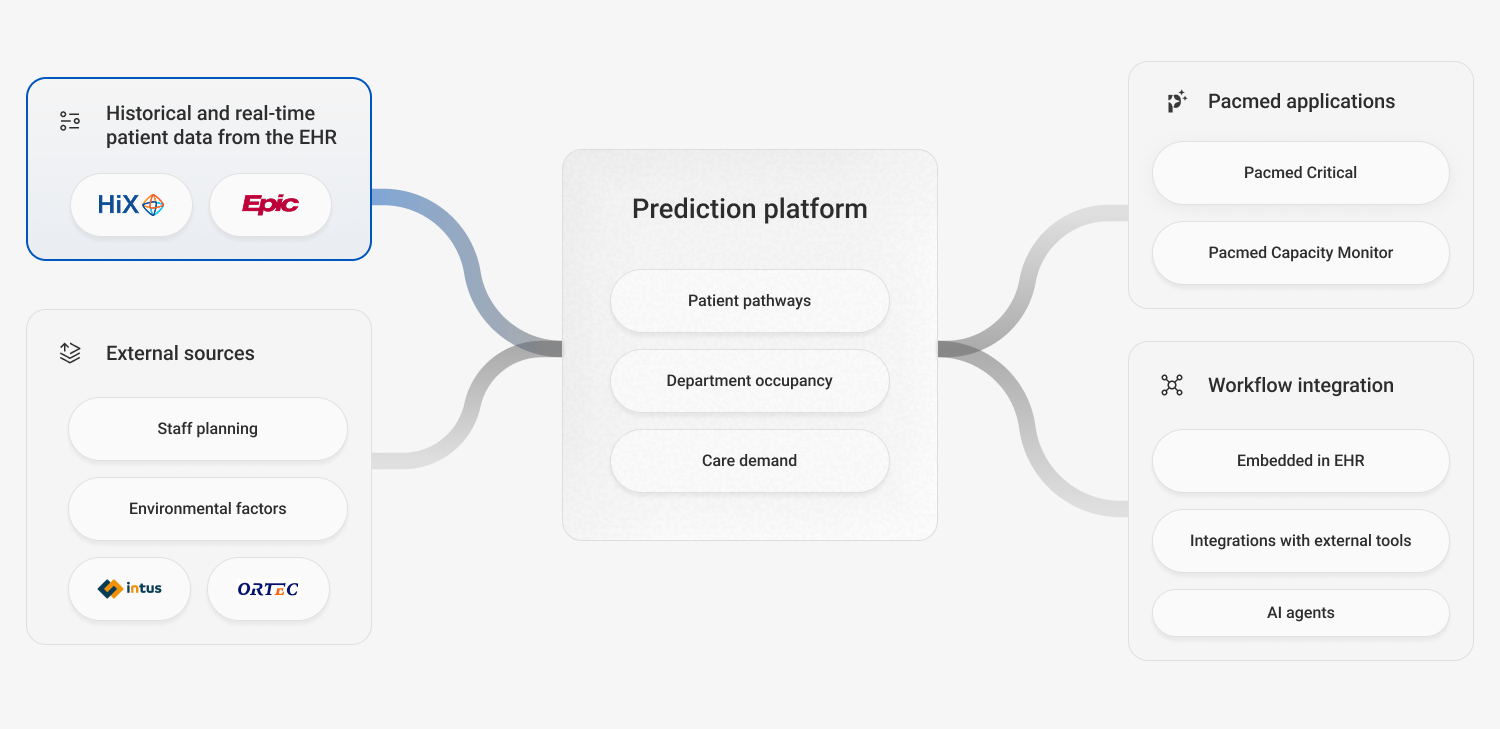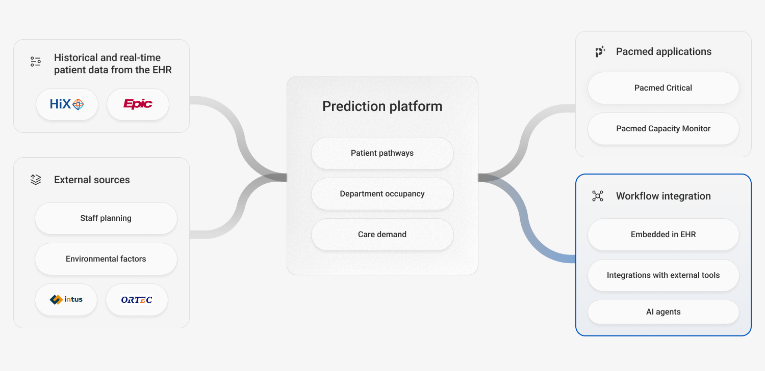 The Pacmed prediction platform integrates real-time patient data with environmental factors (e.g., weather information) and enables the creation of advanced AI models. This allows complex AI models to be trained on demand to model patient trajectories, department occupancy, and care demand, and to generate real-time forecasts. We integrate these predictions seamlessly into the workflow.
