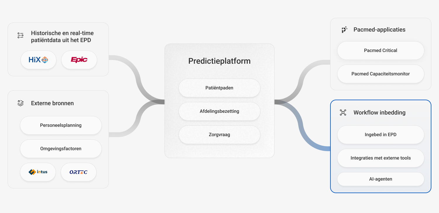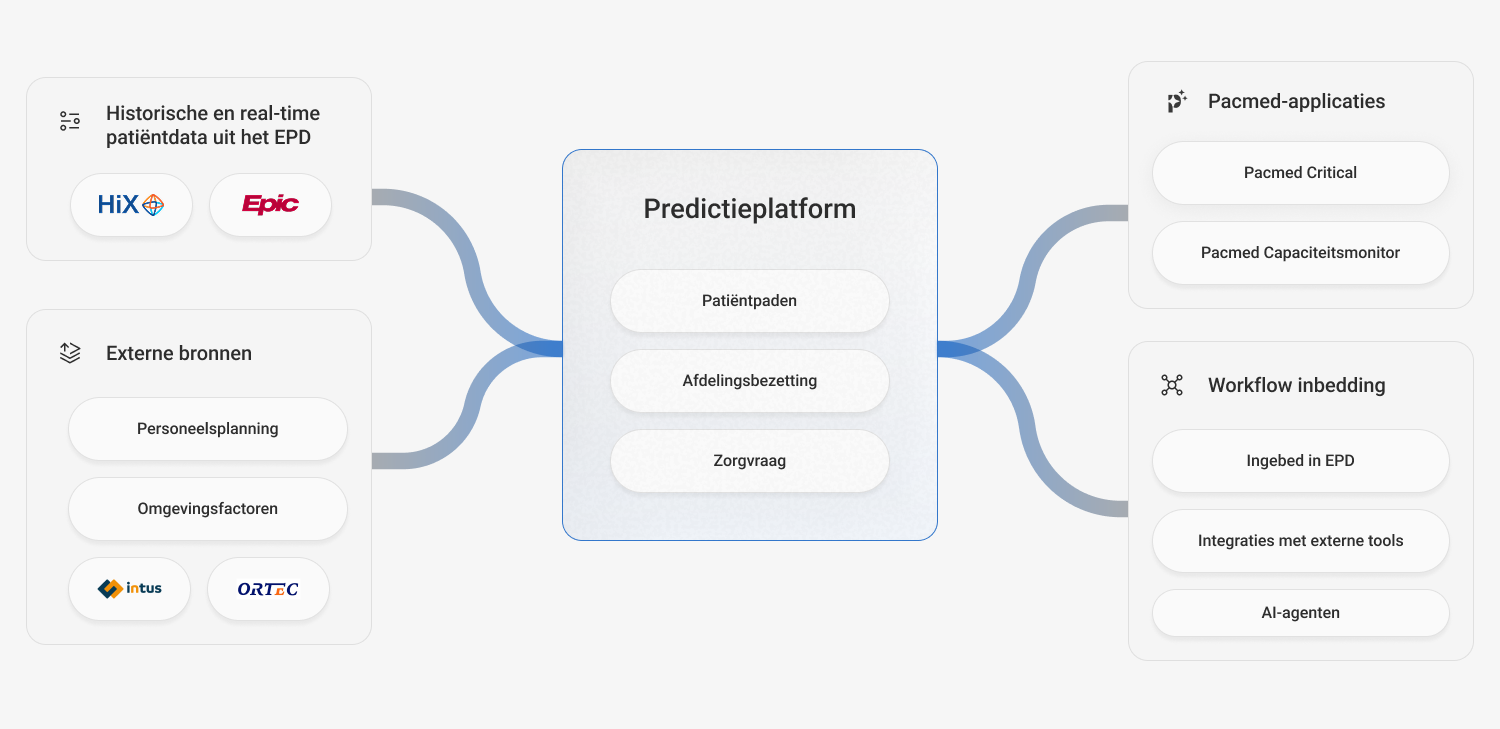 Het Pacmed predictieplatform integreert real-time patiëntdata met omgevingsfactoren (bijv. weersinformatie) en maakt het mogelijk geavanceerde AI modellen te maken. Hiermee wordt het mogelijk on demand complexe AI modellen te trainen om patiëntpaden, afdelingsbezetting en zorgvraag te modelleren en real-time forecasts te genereren. Deze predicties integreren we naadloos in de workflow.